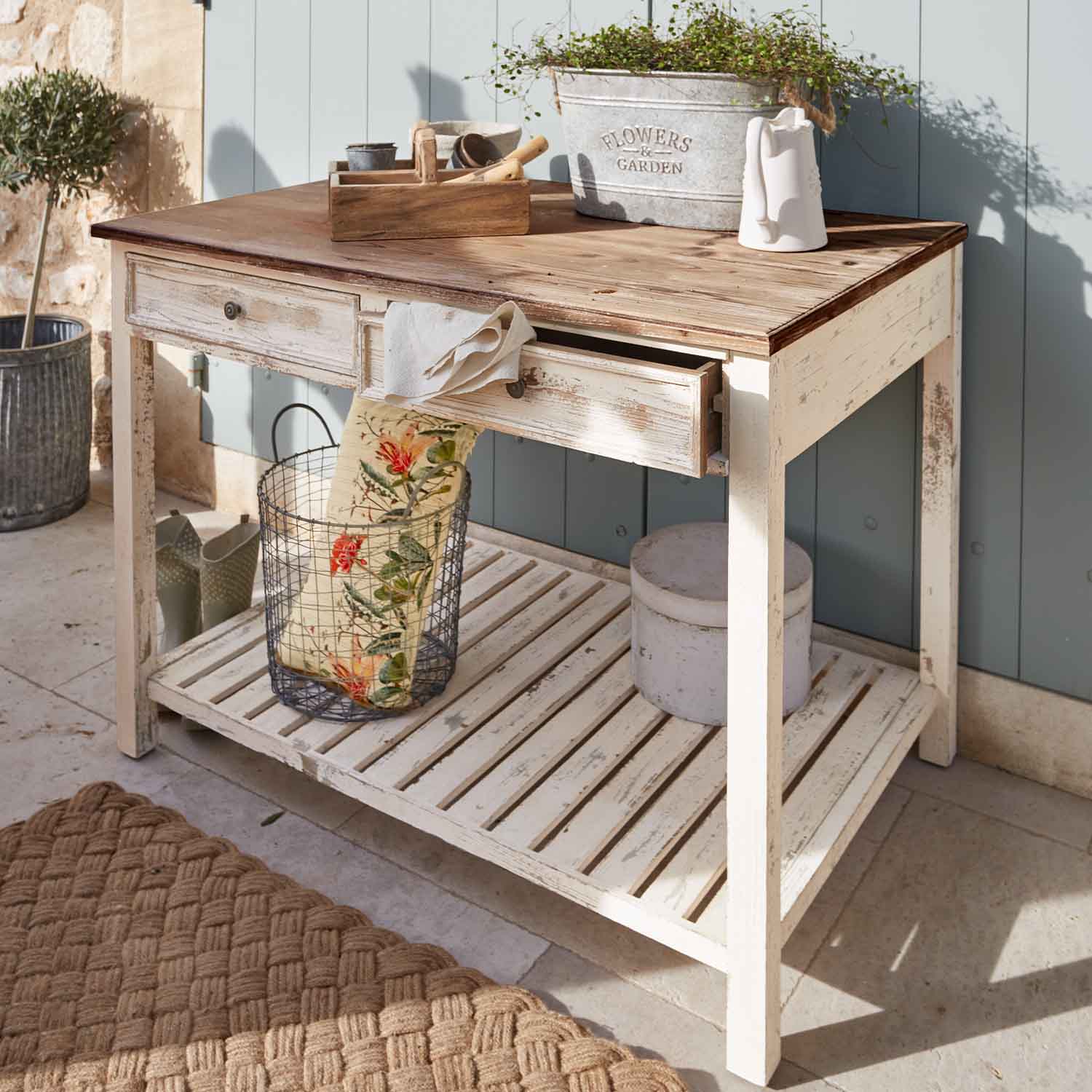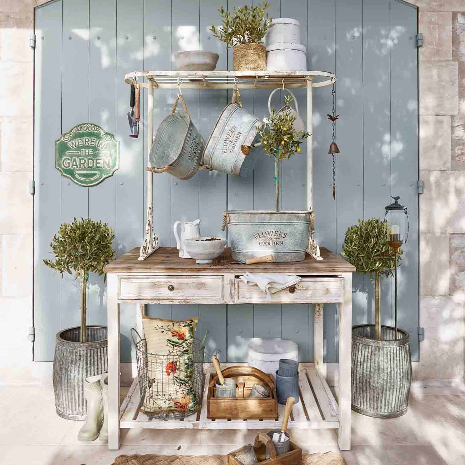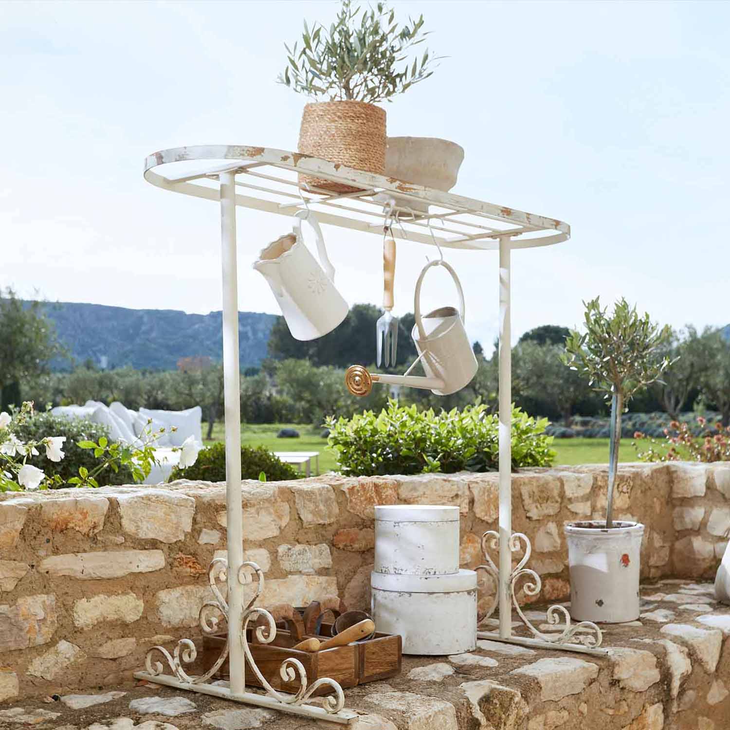 Una postazione elegante con ripiani per terra, vasi e utensili da giardino.